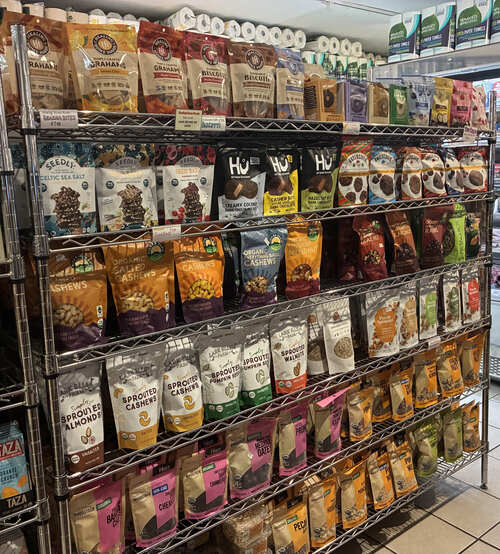 Snack Shelf - filled to the brim with delicious and nutritionally packed products - this is where you can find your packaged nuts and seeds (including sprouted ones), trail mix, dried fruit, and some of our favorite on-the-go snacks that fulfil cravings without all the added sugar, preservatives and processing.