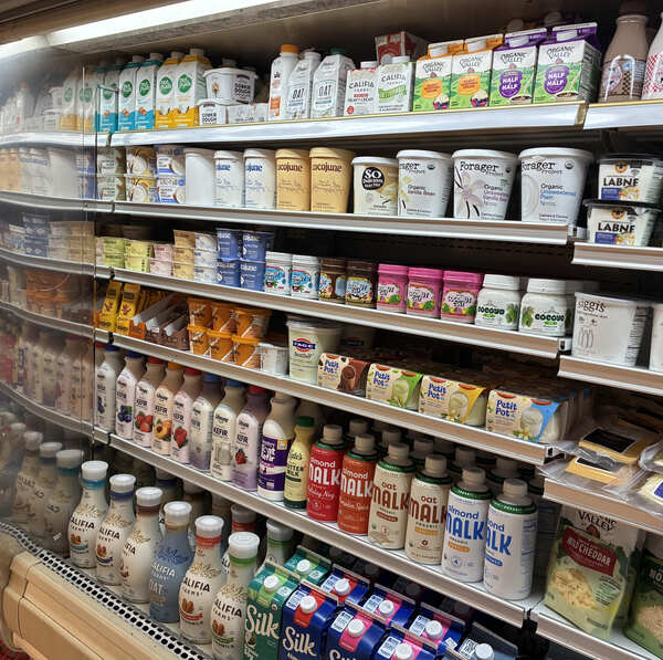 Our dairy fridge features Organic Valley classics alongside Califia and Oat Malk dairy‑alts.