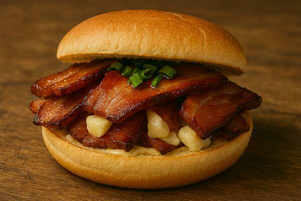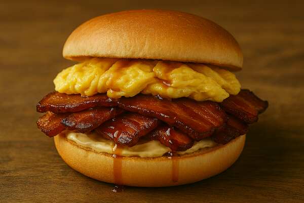 A breakfast sandwich built on contrast: crispy bacon, whipped maple butter, and a soft egg folded into a warm brioche bun. It’s the kind of flavor that makes you rethink your morning routine — and maybe your life choices.