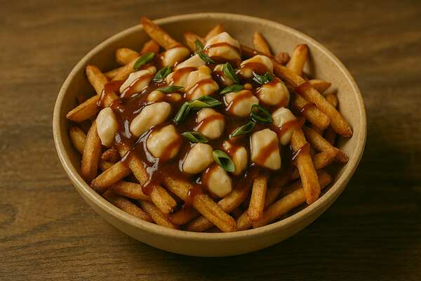 Golden fries smothered in rich brown gravy and squeaky cheese curds, topped with a sprinkle of green onion and a drizzle of maple reduction. It’s the kind of dish that feels like a campfire story — warm, layered, and just a little wild.